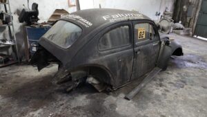 Hoje vamos voltar ao passado: trabalharemos em um Fusca. Fomos solicitados a desenvolver uma peça peculiar — um aerofólio de grandes dimensões. Para realizar esse serviço, necessitamos de uma carroceria, mas nosso cliente se encontra em outro estado do país. O jeito foi recorrer à sucata e adquirir uma carroceria antiga que nos servirá para este projeto.