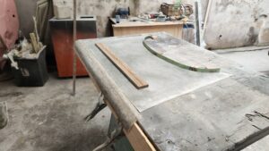 Mãos à obra! Fabricamos uma chapa de PRFV para modelar as superfícies. Utilizamos tecido bidirecional para estabilizar a chapa e a reforçamos com manta de fio picado. Para acertar o ângulo e dar suporte à modelagem, empregamos uma estrutura de compensado com nervuras de sarrafos, formando uma base rígida. Arqueamos as duas laterais para manter semelhança com o design do carro. Modelamos uma curva sobre um tubo, criando uma meia-cana para a rabeta.