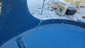 Utilizando máquinas e ferramentas a bateria, realizamos o desbaste das superfícies para que pudessem receber a laminação de reforço. Os reparos foram finalizados com pintura em gel isoftálico com pigmento PNG e proteção UV.